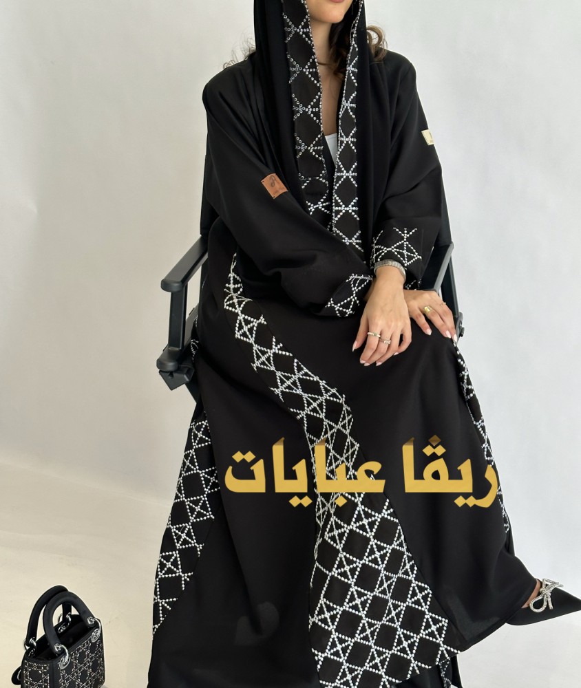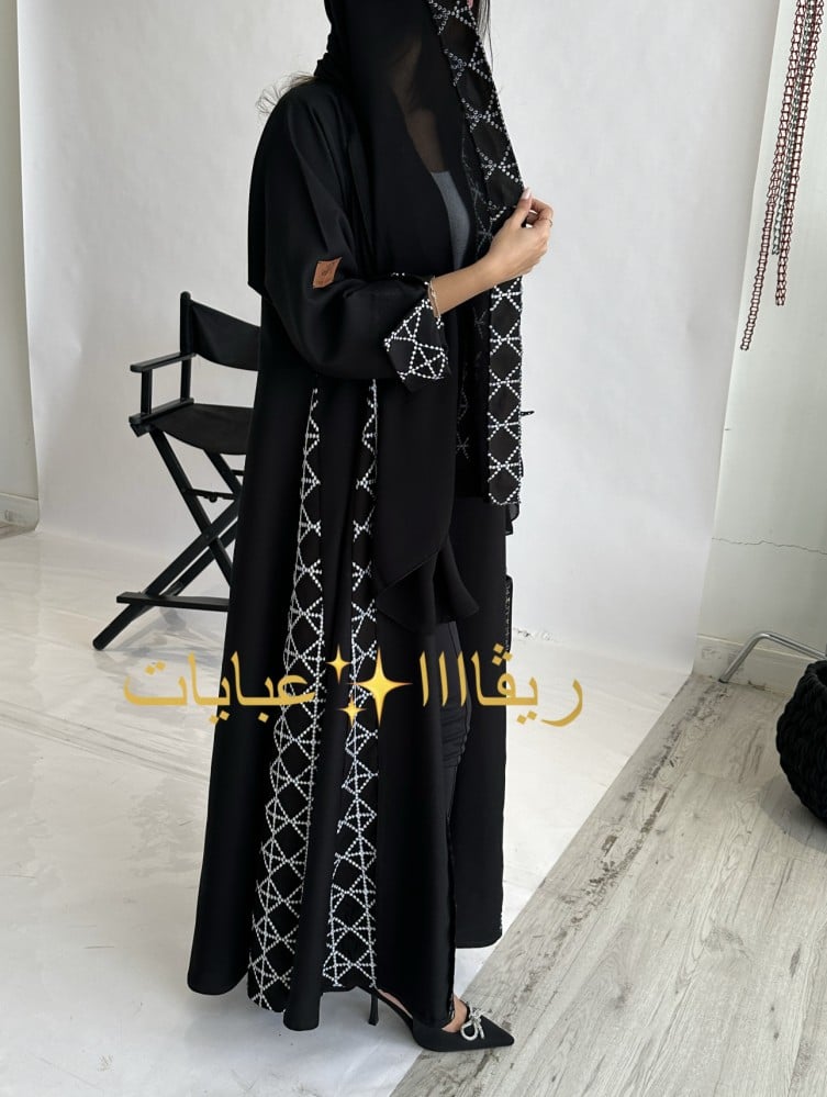 عباية كلوش تطريز ابيض مع قصة اسود قماش كتان مع طرحةهدية